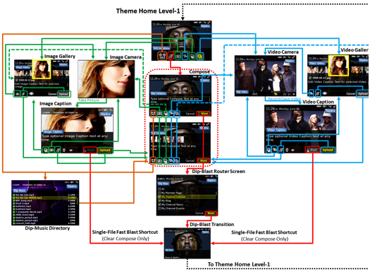 - Content Capture and Blast – Access to Bold Image/Video Camera, proprietary intuitive Text Entry Mode for quick entry of text Captions, dedicated Dip-Music MP3 file folder and Dip-Compose and Blast for one-click post.